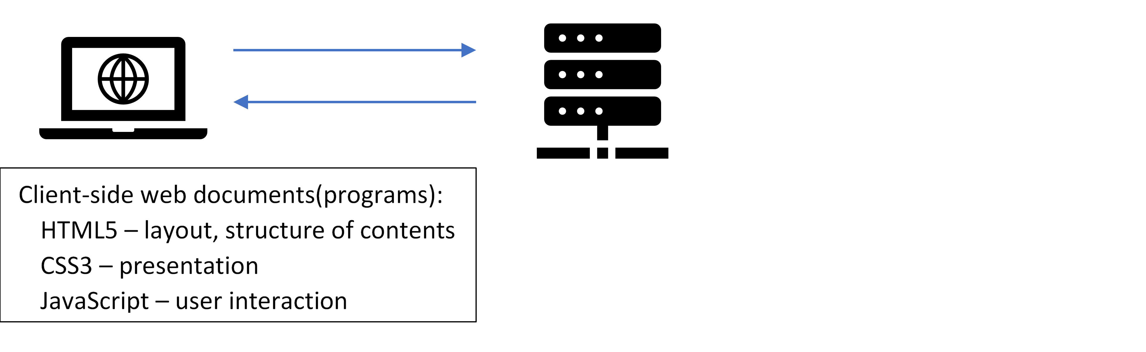 - There are two sides in dynamic web applications - Front-end (client-side) and back-end (server-side).